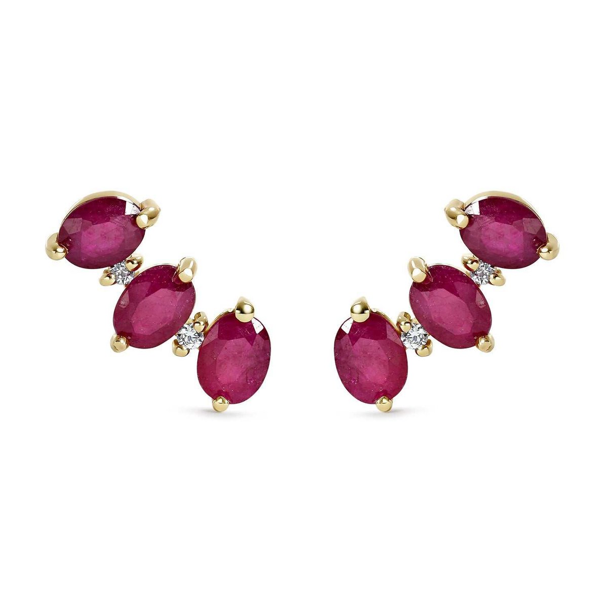 Deze 18k geelgoud oorbellen zijn echt Luxe juweel. Elke stuk is zorgvuldig vervaardigd met diamanten van 0,048 karaat, geclassificeerd als HS12, en fijne robijnen. De schittering en elegantie van diamanten worden perfect aangevuld door de intense rode kleur van robijnen, waardoor een oogverblindend contrast ontstaat.